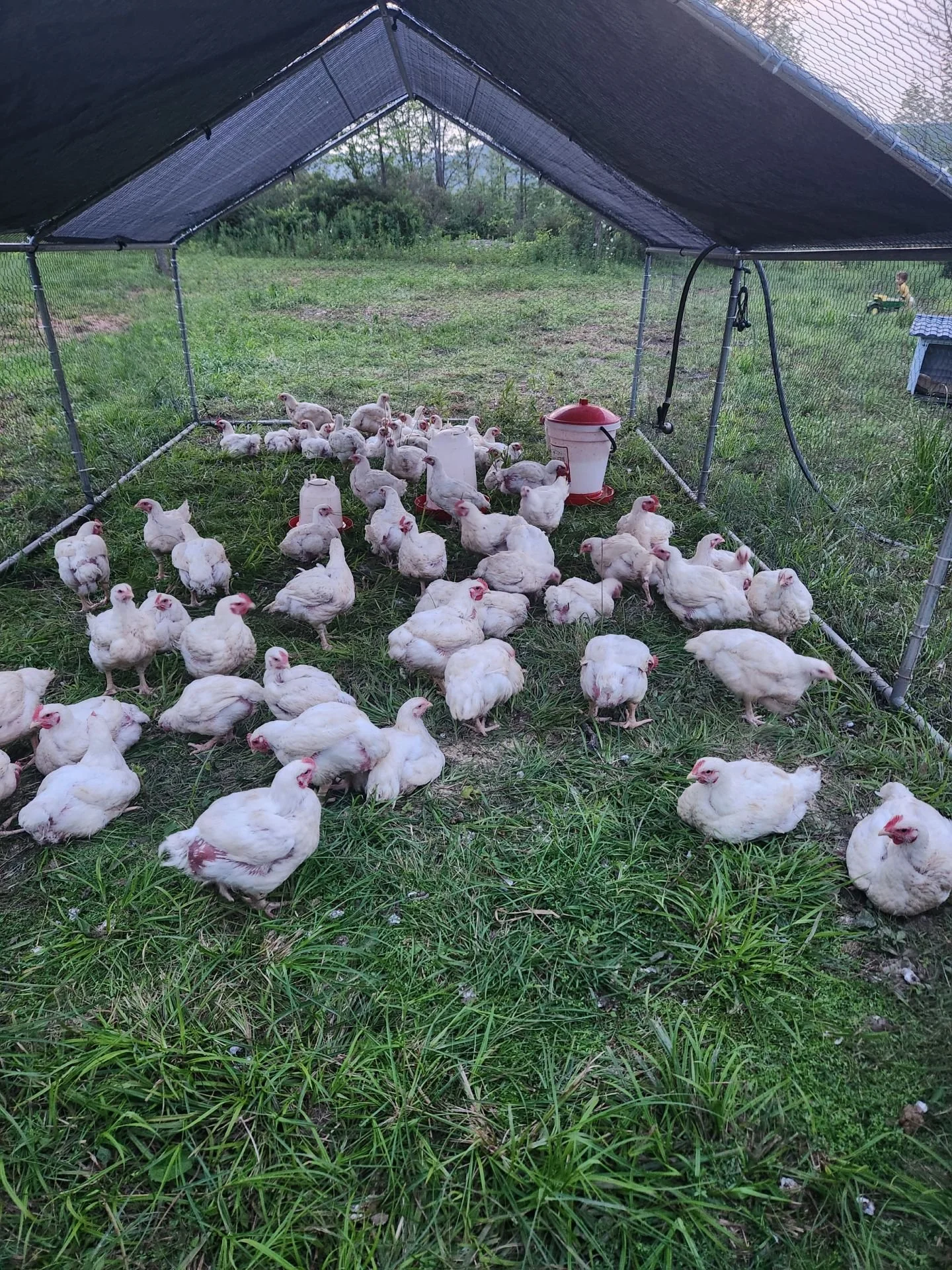 Our chickens are pasture raised. They are moved to fresh pasture twice per day. They are supplemented with unmedicated local feed and consume our organic clover patch and insects. They are never given antibiotics or growth hormones.